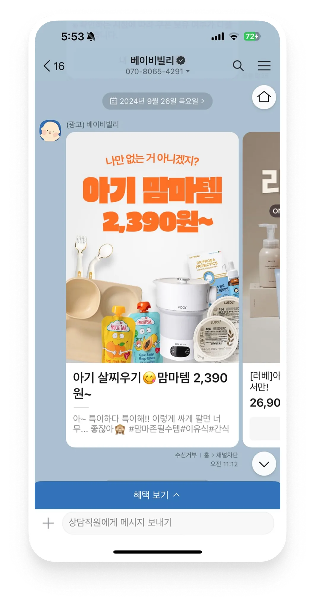 베이비빌리 카카오 플러스 친구 전체 타겟으로 발송되는 캐러셀 형식의 메시지