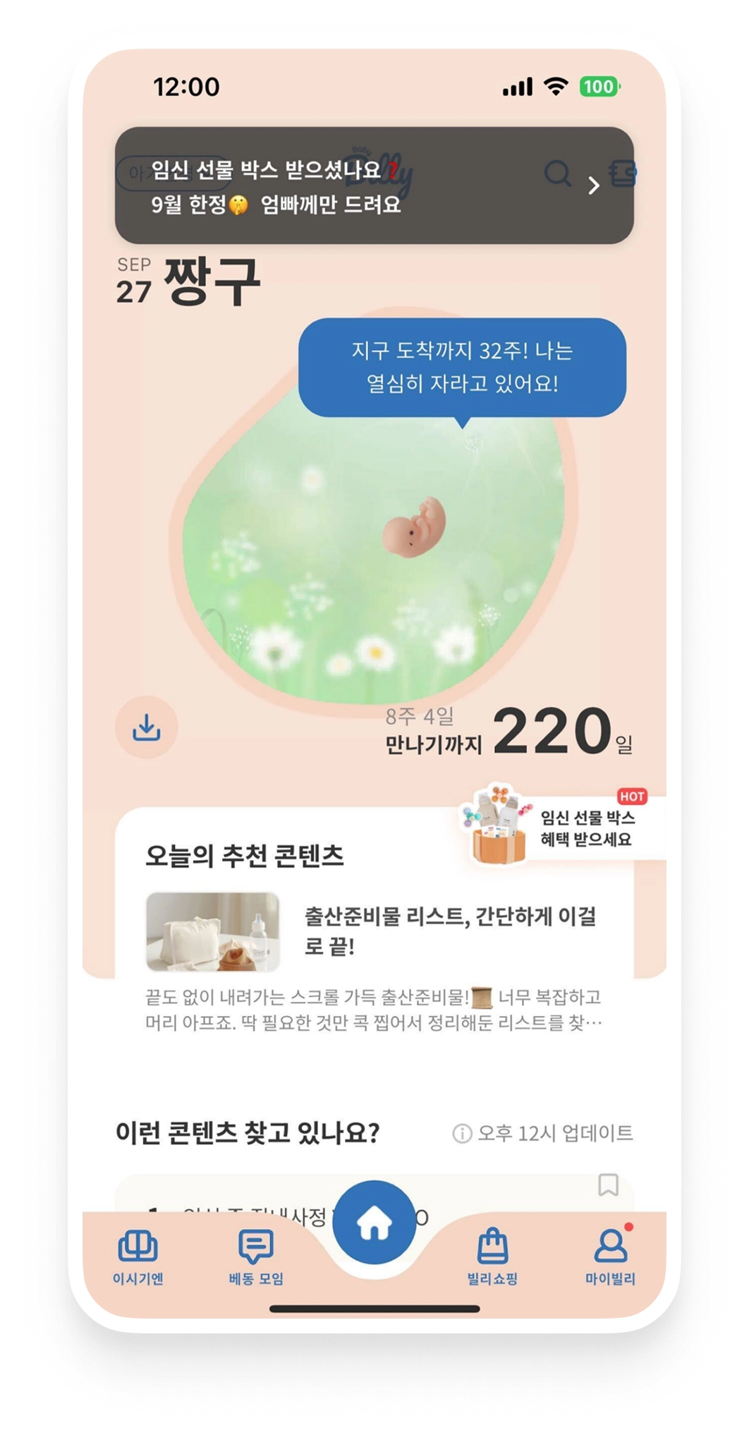 베이비빌리 앱 실행 후 먼저 보게 되는 메인화면에서 팝업 단독 구좌