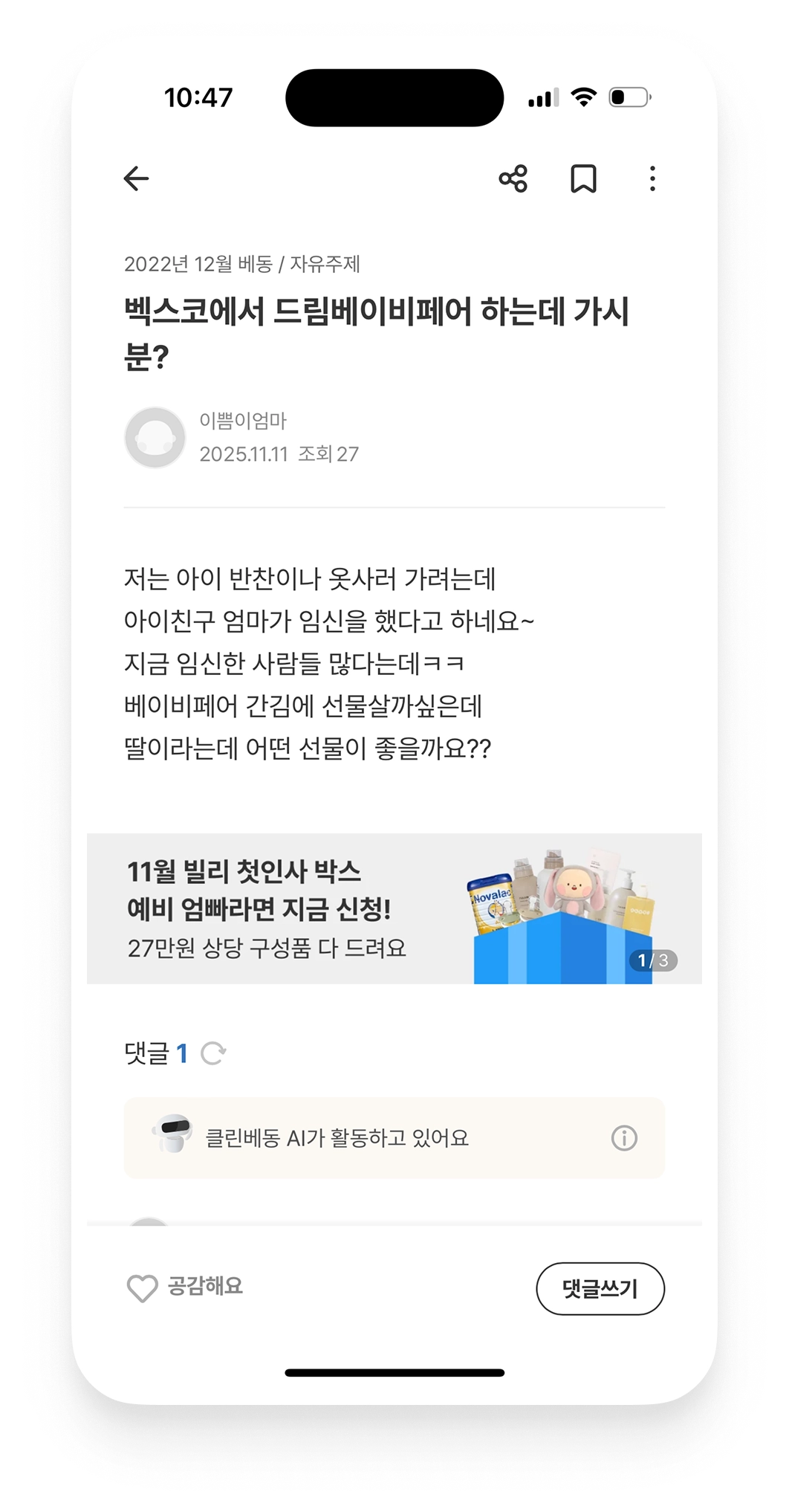 베동 홈 화면과 글 상세화면에서 동시 노출