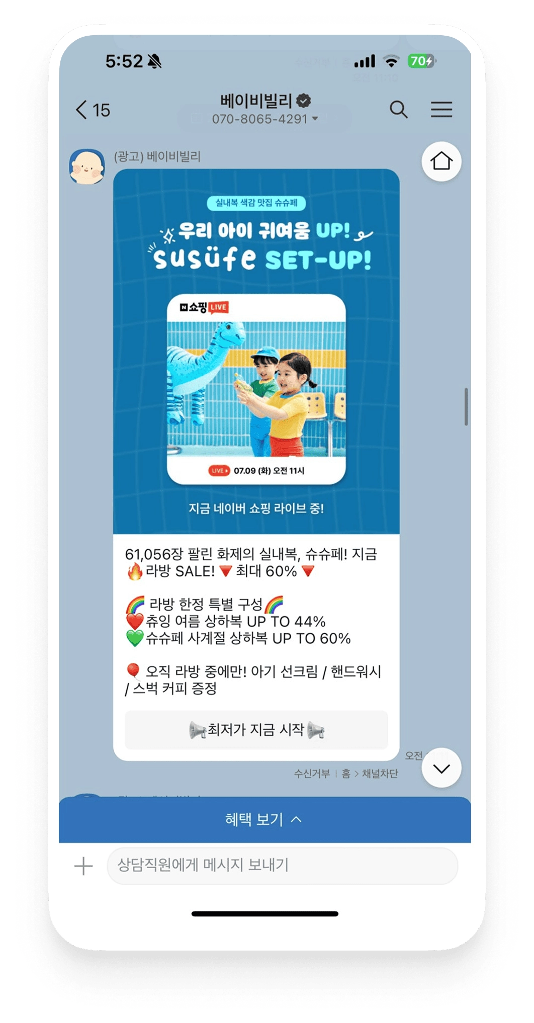 베이비빌리 진성 유저인 카카오 플러스 친구 타겟으로 발송되는 메시지
