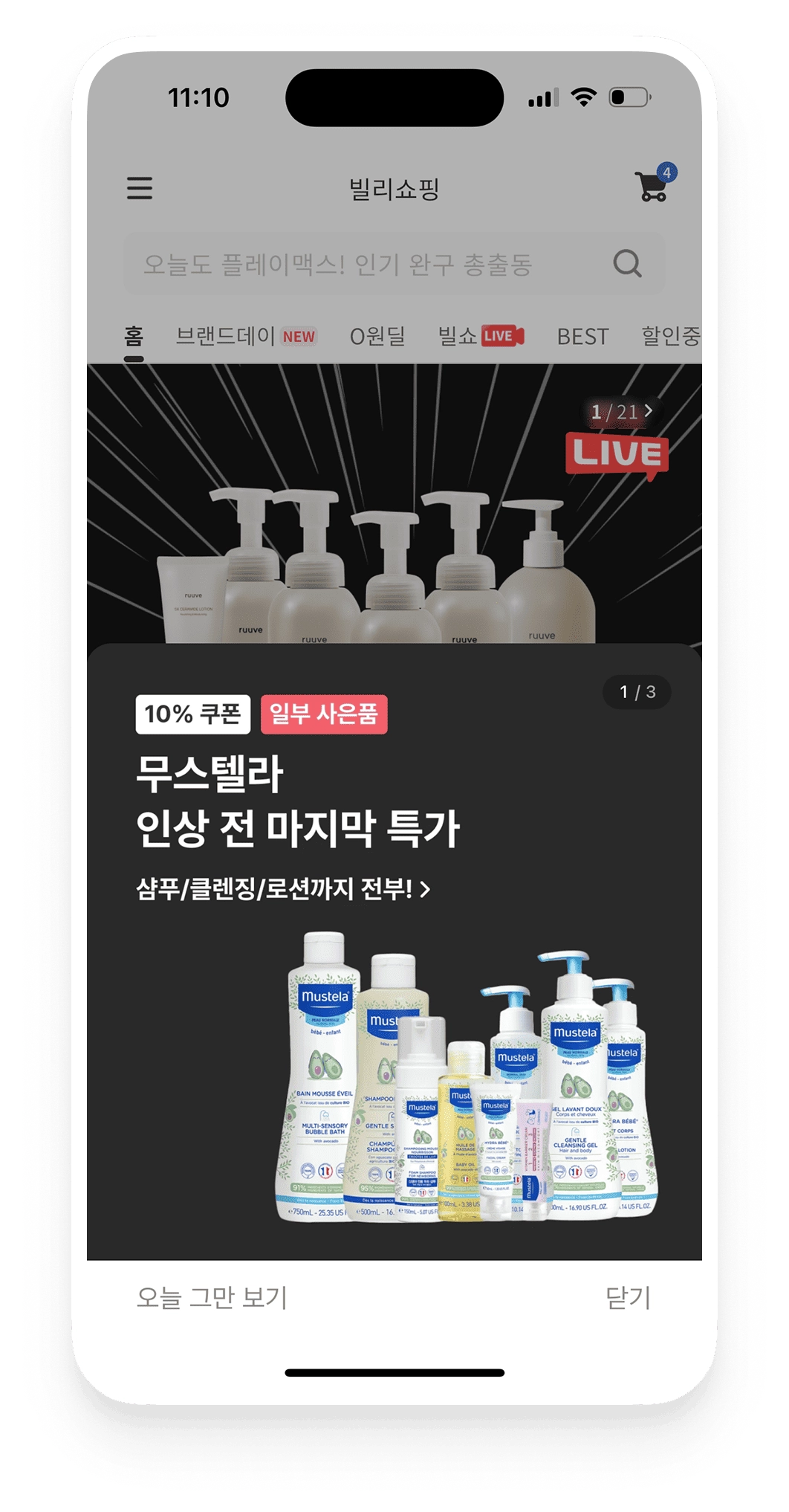 베이비빌리 앱 내 커머스인 빌리쇼핑 탭에 가장 먼저 노출되는 팝업 단독 구좌