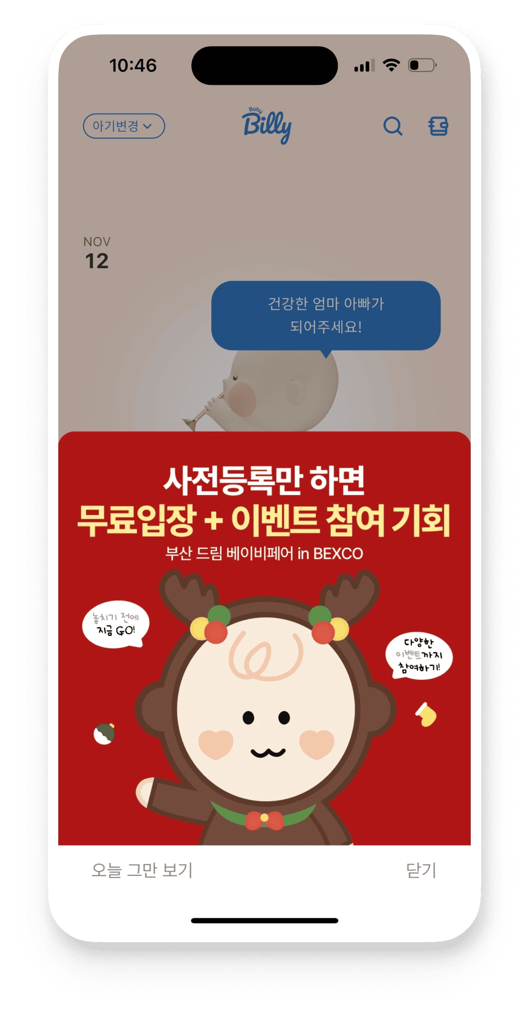 베이비빌리 앱을 사용하는 모든 유저에게 앱을 오픈하자마자 노출되는 광고 이미지로 브랜드,